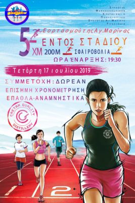 Ο Σύλλογος Μαραθωνοδρόμων Κρήτης και ο Πολιτιστικός Σύλλογος Αγ.Μαρίνας Τσαλικάκη διοργανώνουν την Τετάρτη 17 Ιουλίου αγωνιστικό δρόμο 5.000 μ. με χρονομέτρηση, 200M και ΣΦΑΙΡΟΒΟΛΙΑ στο Εθνικό Στάδιο Ηρακλείου (Χανιόπορτα) στα πλαίσια του εορτασμού της Αγ.Μαρίνας