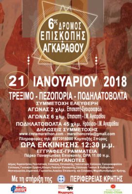 Ο Σύλλογος Μαραθωνοδρόμων Κρήτης, ο Δήμος Χερσονήσου , ο Πολιτιστικός Σύλλογος Επισκοπής, ο Πολιτιστικός Σύλλογος Σγουροκεφαλίου, ο Σύλλογος Γυναικών ΕΡΓΑΝΗ, η Κίνηση Πολιτών Επισκοπής, οι Σύλλογοι Γονέων & Κηδεμόνων Νηπιαγωγείου, Δημοτικού, Γυμνασίου και Λυκείου Επισκοπής με τη στήριξη της Περιφέρειας Κρήτης, διοργανώνουν τον 6ο ΔΡΟΜΟ ΕΠΙΣΚΟΠΗΣ- Ι.Μ. ΑΓΚΑΡΑΘΟΥ.